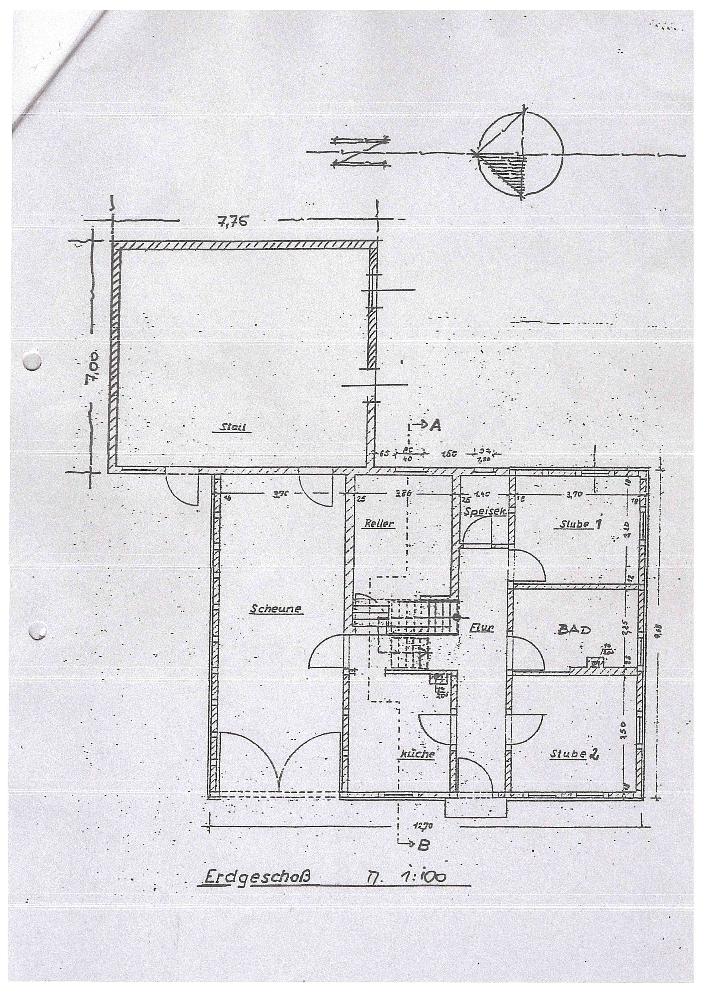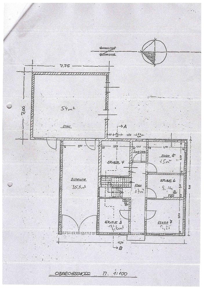 Zum Verkauf steht ein Bauernhaus mit 7 Zimmern und einer Wohnfläche von ca. 177 m². Außerdem befinden sich auf dem Grundstück eine Scheune und ein Stall.